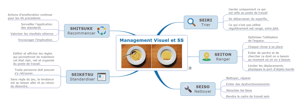 Accueil Management Lean Management : un Mind Mapping pour tout comprendre ManagementManagement EquipeManagement PerformanceManagement ProjetManagement Stratégique Lean Management : un Mind Mapping pour tout comprendre par Patrick NEVEU 28 juillet 2020 par Patrick NEVEU 28 juillet 2020 3k vues 5 min de lecture Sommaire Observer et voirOutils pour observer et voirMéthodes qui peuvent se jouer visuellementFinalité : autonomiser et responsabiliser pour gagner en efficienceConclusion 27partages Le management visuel trouve ses racines dans le Lean Management. Pour mieux comprendre pourquoi, nous avons décidé de vous offrir ce Mind Mapping sur le Lean Management. Vous comprendrez alors que le Management Visuel est un des piliers de la réussite de toute approche de Lean Management. Cette Map est dans sa version 1. Entreprendre ce travail qui propose un résumé croisant plusieurs sources est un travail de longue haleine. Entre les approches philosophiques et les approches techniques, le tri est long et le choix risqué pour offrir une synthèse qui convient à la majorité des lecteurs. Nous veillons à bien intégrer les informations les plus récentes sur le sujet et pour cela, nous comptons sur votre collaboration si vous le souhaitez. Nous avons raté une source importante, vous avez un avis différent sur un passage, nous vous écoutons pour faire évoluer cette map et sortir une version 2, puis 3… comme les logiciels. VOIR LA MAP INTERACTIVE Observer et voir Dans cet article, nous n’allons pas résumer le Lean Management. Nous allons plutôt mettre en perspective les bénéfices du Management Visuel dans une approche moderne du Lean Management en ce 21ème siècle. Le Management Visuel sert avant tout à Observer et Voir. OBSERVER pour identifier les déviations, les événements anormaux, les problèmes,VOIR pour identifier les problèmes et visualiser le degré d’avancement de résolution du problème. Cela signifie qu’il y a une différence entre observer et voir. Et oui ! Nous mettons en place des indicateurs pour observer, pour nous indiquer quoi regarder ce qui nous permet de voir les problèmes, de les interpréter pour les résoudre. Le Management Visuel, ce n’est pas seulement utile en cas de problème. C’est aussi utile en amont de la démarche pour clarifier les process, les standards pour offrir des référentiels clairs qui facilitent la mesure et le contrôle des écarts en aval de la démarche. Réalisation des tâches : de façon la plus standard possible, rappeler aux personnes impliquées l’enchaînement.Contrôle et mesure : mesure de la performance, contrôle des processus.Résolution de problèmes : détection des situations anormales, enclenchement réactif des contre-mesures nécessaires.Impliquer les personnes : personnes supports pour venir voir et agir sur le terrain, échanges sur la résolution des problèmes ou l’amélioration des process et des postes de travail.Valoriser les résultats et les actions d’amélioration. Outils pour observer et voir Structures : schémas, graphiques, kanban.Couleurs : codages de couleur, lignes de couleur.Panneaux : contrôle ou d’avancement, information de zone.Autres : cadrans, jauges, check-lists. Méthodes qui peuvent se jouer visuellement Méthodologie A3Les 5 S5 pourquoiMéthode SMED…. Finalité : autonomiser et responsabiliser pour gagner en efficience Le management visuel expose l’information sans avoir à la demander au chef, évitant ainsi une perte de temps à attendre l’information dans un ballet d’aller/retour, source au passage, d’erreurs et d’interprétations. Par contre, un point clé, l’animation des supports visuels ! Nous sommes fréquemment appelés, non pas pour aider à installer les méthodes et les outils visuels mais pour les animer afin que la démarche persiste et s’inscrive dans la durée. Si c’est pour appliquer une recette, pour faire du 5S, du SMED, du Rouge/Vert, en croyant que chaque collaborateur va s’y mettre du premier coup, raté ! L’intérêt principal du Lean, c’est de permettre de voir autrement ou de changer les comportements ! Et qui dit changement de comportement, dit travail sur l’envie de l’être humain de changer. Cela s’accompagne pour obtenir un changement durable. Mais bon, certains croient encore qu’il suffit de mettre les outils à disposition. Conclusion A côte des outils, il est impératif d’écrire les règles d’animation, de mise à jour de l’information, de périmètre d’intervention… pour permettre à chacun de savoir quand et comment intervenir sans obtenir l’autorisation à chaque fois. L’autorisation est donnée par les règles et par la confiance placée dans l’être humain, la croyance que chacun va respecter les règles. Une fois cela dit, vous comprendrez aussi que la réussite d’une démarche Lean Management dépend de la culture. L’approche s’est inspirée des méthodes de Toyota avec en toile de fond la culture japonaise. Nous sommes en France et faire confiance dans l’être humain, ce n’est pas encore une valeur partagée par tous les managers. Et c’est une des raisons de l’échec du Lean Management dans certaines organisations. 27partages Tu aimes ?UnlikeLiked1 Vous aimez. Veuillez patienter... Lean ManagementManagement visuel 0 Commentaire Patrick NEVEU Co-fondateur de Signos / Formateur en Management Visuel Facilitateur et Coach Visuel Post précèdent #ActuMapping Coronavirus – Aides aux entreprises Post suivant #MapSommaire : Apprendre avec le Mind Mapping Vous pourrez aussi aimer Multimodalités De Travail (4/4) : Nouvelles cultures managériales 22 mai 2019 Multimodalités De Travail (3/4) : Les Nouvelles Méthodes... 1 mai 2019 Multimodalités de travail (2/4) : Les Nouveaux Outils... 4 avril 2019 Multimodalités de travail (1/4) : Les Nouveaux Espaces... 13 mars 2019 La particule élémentaire du management 19 février 2019 Du management visuel au leadership visuel