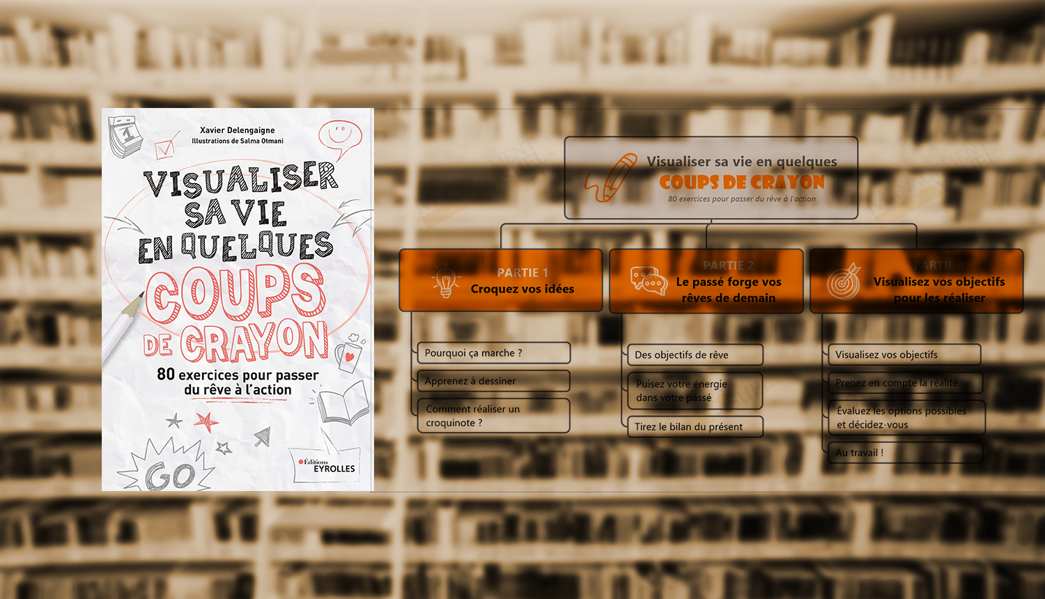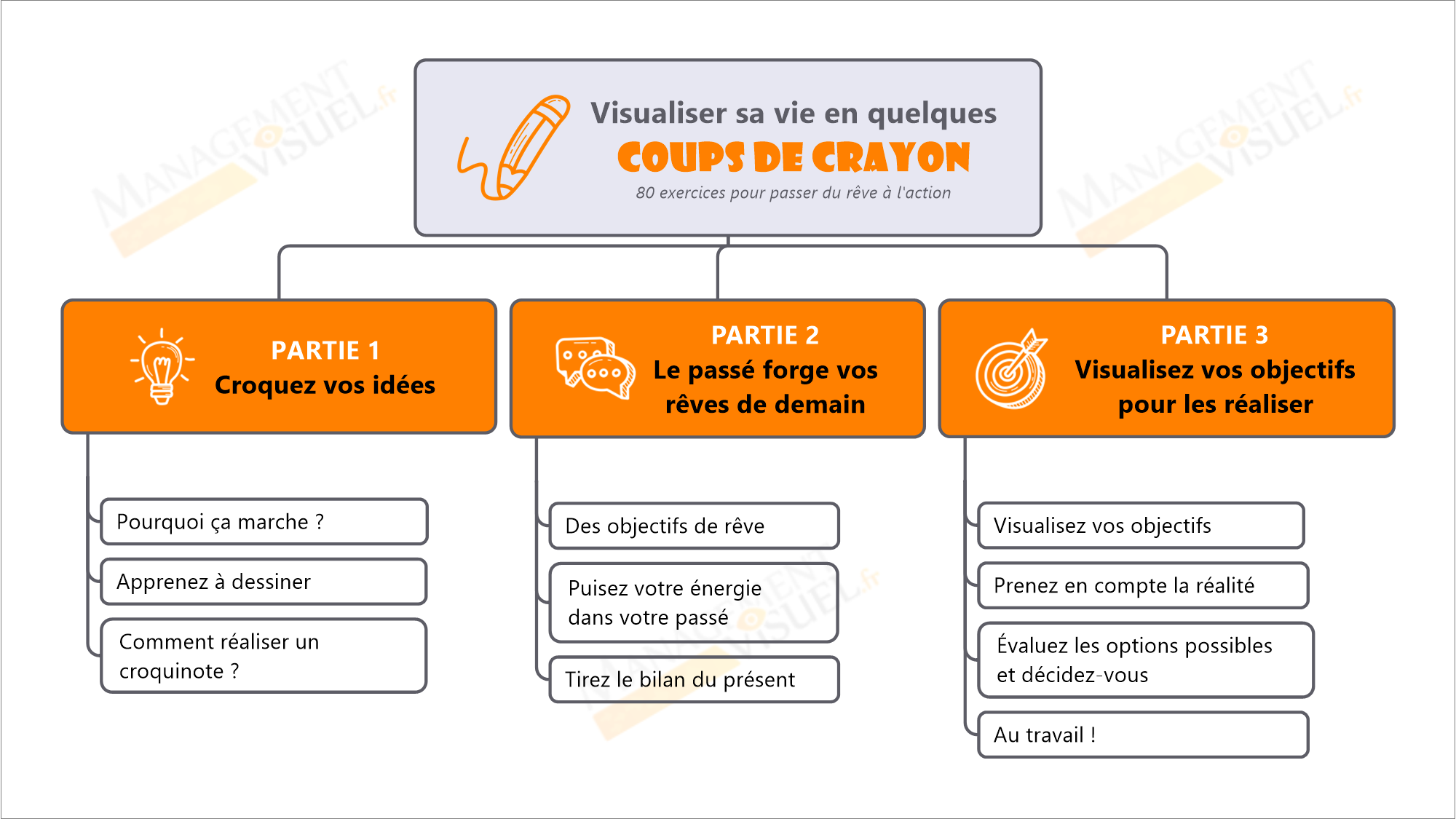 Accueil RessourcesLivres #MapSommaire : Visualiser sa vie en quelques Coups de Crayon Livres #MapSommaire : Visualiser sa vie en quelques Coups de Crayon par Franco MASUCCI 10 janvier 2022 par Franco MASUCCI 10 janvier 2022 1k vues 2 min de lecture 1Partages Auteurs : Xavier Delengaigne et Salma Otmani Prix : 18,00 €Parution : 14 janvier 2021Nb de pages : 352 pagesISBN13 : 978-2212574036Edition : Eyrolles Quatrième de couverture Et si un dessin vous aidait à y voir plus clair ? Désirs de renouveau, ambitions refoulées, doutes, inquiétudes… Nous sommes tous confrontés, un jour ou l’autre, à ces indécisions et à ces envies. Mais comment y voir plus clair ? Cet ouvrage enrichi de plus de 80 exercices propose une méthode simple pour vous exprimer et représenter tout simple-ment sous forme visuelle vos idées, pensées, rêves, etc. N’ayez crainte, nul besoin d’être un artiste pour vous appro prier ces techniques ! Les auteurs vous fournissent une boîte à outils prête à l’emploi. Vous pourrez l’utiliser aisément au quotidien (pictos, croquis, objets, etc.) pour définir vos valeurs et motivations, cerner vos objectifs, prendre les bonnes décisions. Grâce à elle, vous pourrez enfin vivre pleinement vos rêves ! Prenez votre vie en main, découvrez ce que vous voulez vraiment et donnez vie à vos projets ! VOIR LA MAP INTERACTIVE ACHETER LE LIVRE SUR AMAZON 1Partages Tu aimes ?LikeLike0 Soyez le premier à aimer ça. Veuillez patienter... Salma OtmanisketchnotingvisualisationXavier Delengaigne 0 Commentaire Franco MASUCCI Co-fondateur de Signos / Expert en Mind Mapping / Passionné de Management Visuel et Pédagogie Visuelle. Post précèdent Livres sur le Mind Mapping Post suivant #MapSommaire : La boîte à outils pour améliorer sa mémoire et sa concentration Vous pourrez aussi aimer #MapSommaire : La boîte à outils pour améliorer... 25 janvier 2022 #MapSommaire : 100 Fiches pour organiser sa veille... 23 janvier 2021 #MapSommaire : Apprendre avec le Mind Mapping 2 novembre 2020 #MapSommaire : Positive Sketching 11 mars 2020 #MapSommaire : Aider son enfant à mieux apprendre 3 mars 2020 #MapSommaire : 101 Astuces pour mieux penser 5 juin 2019 #MapSommaire : Visual Meetings: How Graphics, Sticky Notes... 22 juin 2017 #MapSommaire : Managez avec le Concept Mapping 15 juin 2017 #MapSommaire : 101 astuces pour mieux s’organiser 8 juin 2017 #MapSommaire : Stratégie océan bleu : Comment créer... 1 juin 2017 Laisser un commentaire Annuler la réponse Enregistrer mon nom, mail et site web dans le navigateur pour mes prochains commentaires. * En utilisant ce formulaire vous consentez à l'usage de vos données dans ce site. Δ