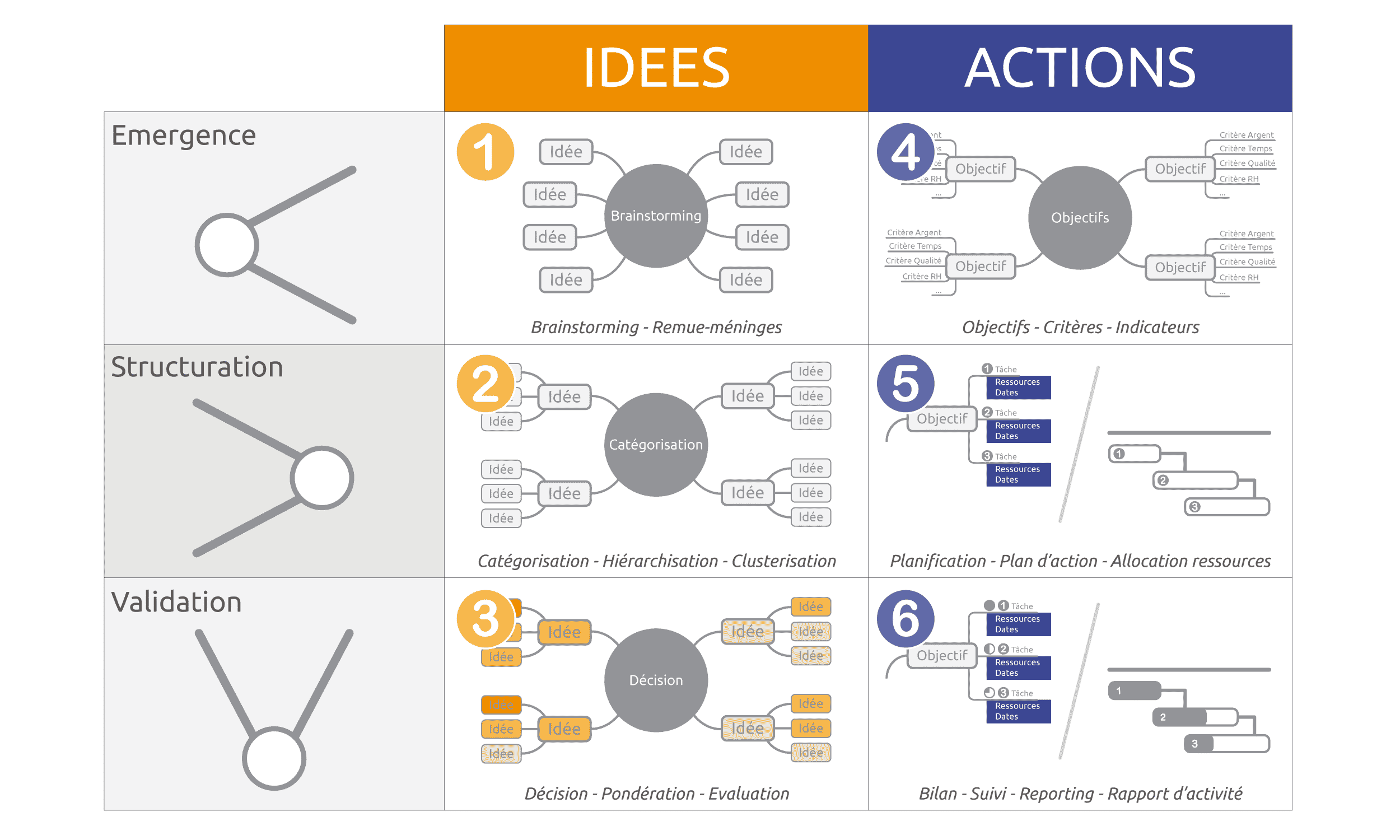 Accueil Management Le #MindMapping Pro en 6 points clés ManagementMind Mapping Le #MindMapping Pro en 6 points clés par Carolina VINCENZONI 5 mai 2017 par Carolina VINCENZONI 5 mai 2017 1k vues 159partages Tout projet naît d’une idée. Le but est de transformer cette idée en action. Le Mind Mapping peut nous accompagner tout au long de ce processus. La méthode Ideaxion s’inspire des règles de l’efficacité cognitive en intégrant le Mind Mapping dans chaque étape de la méthode. Mais la méthode peut tout à fait se jouer sans Mind Mapping, ce sera juste moins efficace et moins confortable au quotidien. Rappelons un des adages de SIGNOS : le maximum de bénéfice avec le minimum d’effort dans un maximum de confort. Deux mondes s’offrent à nous : le monde des idéesle monde des actions Pour faire évoluer une idée vers l’action nous devons mobiliser 3 types de pensée. Ce qui suit s’appuie sur les travaux de Joy Paul Guilford, psychologue et professeur à l’université de Caroline du Sud (Etats-Unis), qui est à l’origine des notions de pensée divergente et convergente. « Pensée divergente » : elle explore, génère des idées. Les québécois parlent d’idéation. Nous parlons communément d’émergence d’idées et c’est ce terme que nous retiendrons dans la méthode Ideaxion.« Pensée convergente » : elle structure, met de l’ordre pour construire des solutions. On regroupe, catégorise et hiérarchise des idées. Nous parlons communément de structuration des idées et et c’est ce terme que nous retiendrons dans la méthode Ideaxion.« Pensée évaluatrice » : elle donne de la valeur aux idées ou aux actions. C’est décider de celles qu’il faut retenir, prioriser. Le mot évaluation est souvent « réservé » au monde de la formation ou réduit à l’entretien annuel d’évaluation. Nous allons lui préférer le terme de validation. La méthode croise donc : la recherche d’efficacité dans les 2 mondes : IDEES – ACTIONS,les 3 modes de pensées avec les termes du « quotidien » : ÉMERGENCE – STRUCTURATION – VALIDATION. Pour faire référence facilement à chaque phase, nous avons créé des néologismes pour mieux se repérer. Ces néologismes servent à signaler que l’intention diffère à chaque phase et que la manière de faire du Mind Mapping sera différente. Nous avons choisi des anglicismes pour dialoguer plus facilement entre différentes langues. Nous retrouvons les 2 mondes : Idea Mapping ou cartographie d’idée et Action Mapping ou cartographie de l’action. Vous en retrouverez d’autres qui ne sont pas dans ce tableau : Problem Mapping ou cartographie de problème, Prez Mapping ou Mapping de présentation (faire un « prez » = présentation). Voyons les 6 néologismes des 6 phases de la méthode : Brainstorming : bon là … terme connu … rien à dire de plus.Brain Mapping : brainstorming organisé. Les idées sont catégorisées et hiérarchisées. Nous avons mis de l’ordre dans nos réflexions.Decision Mapping : nous retenons les idées que nous voulons concrétiser réellement.Goal Mapping : Goal pour but/objectif. Nous transformons les idées en objectifs opérationnels, clairs et évaluables.Plan Mapping : nous élaborons le plan d’action et nous planifions.Progress Mapping : nous suivons et évaluons les actions/projet, les avancements et les difficultés. Les règles de la méthode Edward de Bono, connu par certains pour son livre sur la méthode des 6 chapeaux et ses travaux sur la pensée latérale, a mis en avant l’importance de se focaliser sur le même mode de pensée pour collaborer efficacement. Dans sa méthode des 6 chapeaux, il demande justement à chaque participant de mettre symboliquement, au même moment, le même « chapeau » de couleur faisant référence à un mode de pensée (factuel, émotionnel, jugement, créativité …). Avec la méthode Ideaxion, nous proposons la même démarche. Nous demandons à tous de se mettre dans la même phase de la méthode pour réfléchir. Cela n’interdit pas de faire des aller-retour mais l’objectif est de faire les aller-retour ensemble. Dès que plusieurs participants à une réunion se focalisent sur des aspects différents, au même moment, (émergence, structuration, décision …), ils se défocalisent collectivement ». C’est-à-dire ? Les personnes parlent du même sujet mais pas sur le même canal de pensée. Finalement, ils se juxtaposent voire confronte plus qu’ils ne co-élaborent une réflexion collective. Vous verrez assez vite les logiques de débats stériles ou d’incompréhension s’installer. Certains, peu à l’aise dans le débat, commenceront à se mettre en retrait. Les plus à l’aise domineront les débats pour imposer leur point de vue ou des décisions en terme d’action. Qu’en sera-t-il réellement de l’adhésion à ces idées et ces décisions ? Vous souhaitez obtenir une adhésion plus sincère et une cohésion d’équipe plus forte, pensez donc à la collaboration en mode visuel 😉 159partages Tu aimes ?LikeLike0 Soyez le premier à aimer ça. Veuillez patienter... brain mappingBrainstormingcartes heuristiques professionnellescartes mentales professionnellesDecision MappingGoal Mappingméthode ideaxionméthode Signosmind mapping promind mapping professionnelMonde des actionsMonde des idéesPlan MappingProgress Mapping 0 Commentaire Carolina VINCENZONI Co- Fondatrice et Directrice pédagogique chez Signos Facilitatrice - Formatrice - Coach Sportif Post précèdent #MapSommaire : L’Anglais Facile Avec Le Mind Mapping Post suivant Management Visuel de Projet Vous pourrez aussi aimer Mind Mapping : organisation arborescente 11 mars 2022 Livres sur le Mind Mapping 1 septembre 2021 Lean Management : un Mind Mapping pour tout... 28 juillet 2020 Présentation Mind Mapping (v2020) 14 novembre 2019 Multimodalités De Travail (4/4) : Nouvelles cultures managériales 22 mai 2019 Multimodalités De T