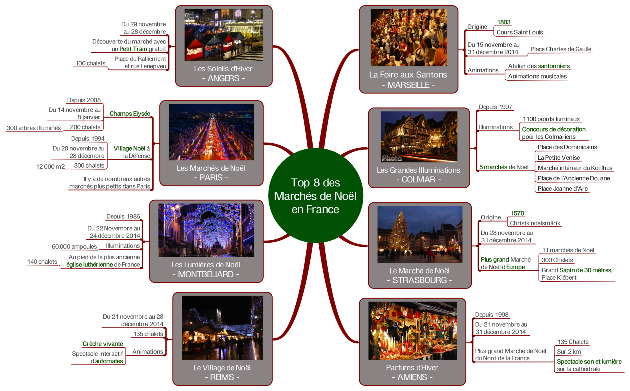 Accueil RessourcesInfoMapping#TopMap #TopMapping – Les 8 meilleurs Marchés de Noël de France #TopMapInfoMapping #TopMapping – Les 8 meilleurs Marchés de Noël de France par Franco MASUCCI 18 décembre 2014 par Franco MASUCCI 18 décembre 2014 26 vues 1 min de lecture 13partages A moins d’une semaine de Noël, nous vous avons préparé un nouveau TopMapping des meilleurs Marchés de Noël français. Chaque année, ces marchés attirent locaux et touristes pour leurs délicieux vins chauds, la vue imprenable qu’offre la grande roue, le Père Noël, les gourmandises régionales ainsi que les illuminations féeriques. Voici donc un petit top des 8 Marchés de Noël à visiter en famille, entre amis ou en amoureux. Cette map est inspirée d’un article paru sur le site d’Easyvoyage. Bonne lecture à tous ! VOIR LE PDF 13partages Tu aimes ?LikeLike0 Soyez le premier à aimer ça. Veuillez patienter... ColmarFranceMachéMarché de NoëlMarseilleNoelParisStrasbourg 0 Commentaire Franco MASUCCI Co-fondateur de Signos / Expert en Mind Mapping / Passionné de Management Visuel et Pédagogie Visuelle. Post précèdent Infographie Religion et Croyance Post suivant #ActuMapping – L’attentat contre Charlie Hebdo #JeSuisCharlie Vous pourrez aussi aimer #ActuMapping – L’attentat contre Charlie Hebdo #JeSuisCharlie 9 janvier 2015 #ActuMapping – La Catalogne veut son indépendance 12 novembre 2014 #ActuMapping – Le prix Nobel de l’économie 2014 24 octobre 2014 #ActuMapping – La grève d’Air France 15 octobre 2014 #ActuMapping – Netflix débarque en France 1 octobre 2014 #TopMapping – Les 10 jeux vidéos les plus... 23 septembre 2014 #ActuMapping – L’indépendance de l’Ecosse 20 septembre 2014 #InfoMapping – Les voitures électriques 11 septembre 2014 #ActuMapping – Le Virus Ebola 13 août 2014 Accord de Libre-Échange Nord-Américain (ALÉNA) 1 août 2014 Laisser un commentaire Annuler la réponse Enregistrer mon nom, mail et site web dans le navigateur pour mes prochains commentaires. * En utilisant ce formulaire vous consentez à l'usage de vos données dans ce site. Δ